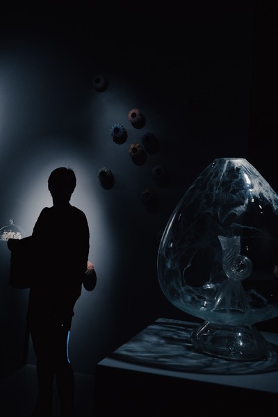 Концепцию «Кабинета изобретателя» поддерживают стеклянные изделия Александры Пацаманюк. Междисциплинарная художница из Петербурга в основном работает с деликатным хрусталём. Ставшая сегодня редкостью техника гравировки по стеклу позволяет Александре при помощи различных алмазных инструментов «вырезать» тончайшие рисунки на хрупкой поверхности, а ручная полировка доводит композицию до безупречного блеска. Из пластичного материала автор создаёт всевозможные фантазийные реликварии — диковинные раковины, выстроенные по идеальным пропорциям Фибоначчи, хрустальные пёрышки, а также кости и хвост динозавра.